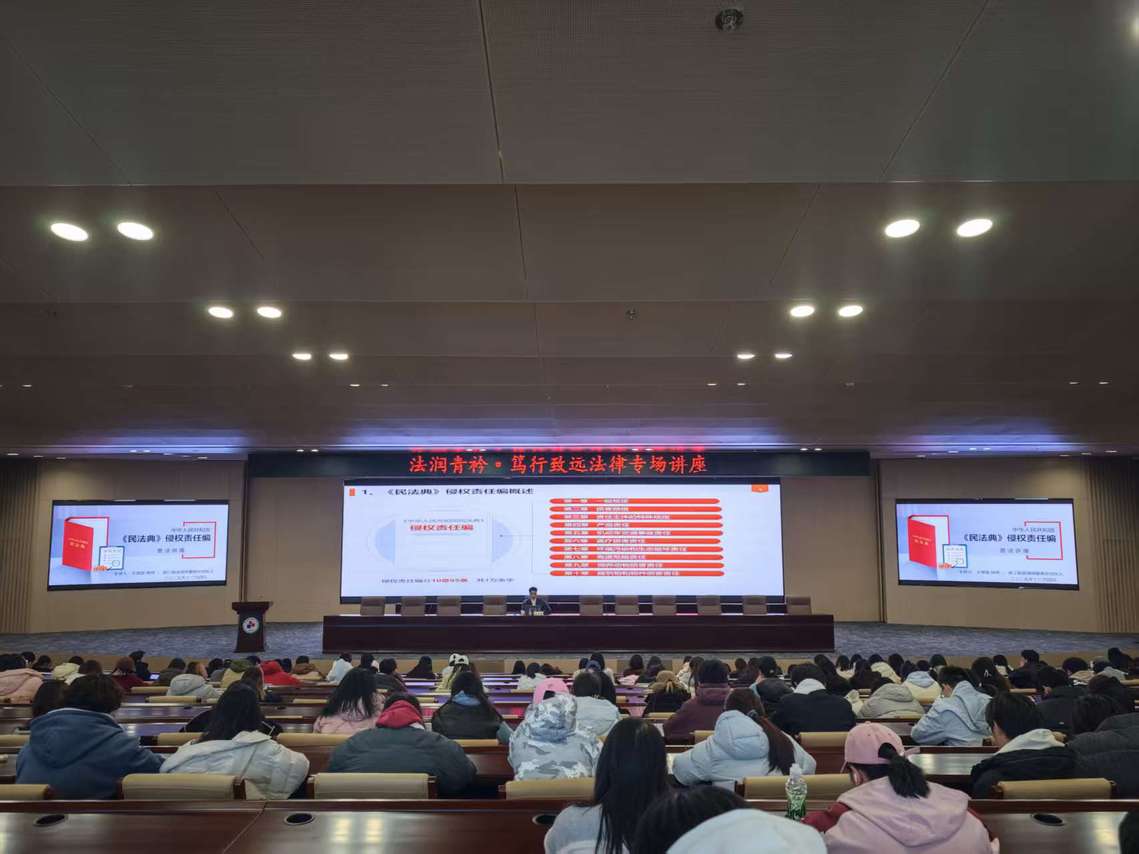 讲座特邀浙江银湖律师事务所王竖国律师担任主讲人,其结合《民法典》侵权责任编核心条款,聚焦学生高频接触场景进行解析:产品责任明确缺陷产品可向生产者或销售者索赔,且生产者、销售者需承担召回义务及相关费用;机动车交通事故责任中“好意同乘”规则,说明非营运车无偿搭乘人受损时,驾驶人无故意或重大过失可减轻责任;网络侵权责任详解“避风港原则”与“红旗原则”,提醒学生规范网络言论;同时提及饲养动物损害责任、高空抛物治理等内容,通过典型案例让法律条款更易理解。讲座尾声,现场还同步介绍了学校校警驿站的常态法律咨询服务,告知师生每周四下午可前往驿站享受免费法律答疑、反诈咨询等服务。